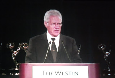 and he laid down the rules for how long speeches could be, and everyone abided nicely by those rules, so much so that the ceremony actually ended early. “Only” two hours instead of the three hours they had endured in years gone by. There were several other guest hosts: a soap opera actress from The Bold and The Beautiful, named Susan Flannery; cute little Nancy Cartwright, who plays the voice of Bart Simpson was witty and amusing. She was so short (and wearing a dress with spaghetti straps) that her shoulders barely came over the top of the podium. She told us that when she had been in for the sound check, earlier, she realized that if she slid her straps down off her shoulders (which she proceeded to do) she looked for all the world like she was standing up there without any clothes on. Now, THAT was amusing!