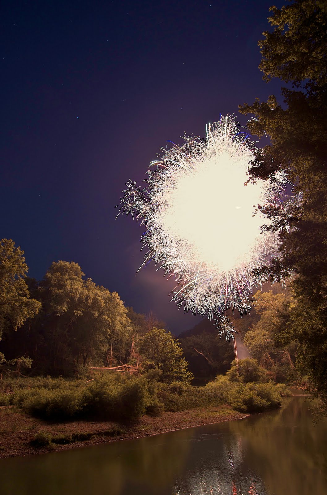Long about suppertime, we wade back across to the riverbank, carrying our chairs, up to an area our hosts mow off for picnicking, we eat fried chicken and whatever summer salads that this year’s pot luck offers up, and at dark, we do our very best to set their field on fire, by shooting off fireworks. They set off $60 fireworks called, “One Bad Mother” and “The Angry Mother-in-Law”. (Holy Cow, fireworks are expensive!) I think we might as well just take dollar bills and hold them up and light them. Now you might think that legal tender burning might not make quite as spectacular a show, but I contend that my pulse WOULD be racing watching my husband stand there and incinerate our income. But it would be very Ebenezer Scroogelike (if you’ll pardon my mixing of holiday metaphors) NOT to enjoy fireworks, and I actually quite love them. My friend Laura and I were sitting there together in the dark on the riverbank watching the fireworks together, our hands and arms in constant motion as we scraped these little swarming black bugs off of us, non-stop, for the half hour we sat there. (And this, after several liberal applications of bug spray.) You know it’s bad when the crowd sees a bat flying by, and begins calling out competitively, “Here, battie bat!!!Come HERE, little bat, and eat MY bugs!!!” Our host and a bunch of the older kids were down on the island, setting off the fireworks, and my husband was trying to get some photographs of the fireworks. So Laura and I dug bugs out of our swimsuit tops, and cheered, and swatted, and laughed, and really, what a grand 4th of July it was!