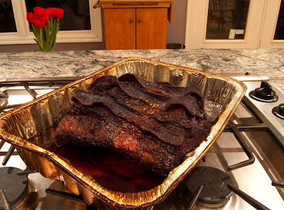And Brisket Watch began. We waited. And waited. At 6:00, after smelling that smoke for 8 hours, I was so hungry I was considering what the consequences of taking it off the grill a little early might be. The whole family was totally hungry and more than ready to eat! At 7:00, I was getting a bit testy. At 8:00, I was feeling faint from hunger. By 9:00, as I sat gnawing my arm off, the Big Bison said he’d be taking the brisket off the smoker soon, and then, we’d have to WAIT 30 MINUTES. (Insert sound of maniacal laughter.) Really? You’d like me to wait? The children are in their pajamas and headed for bed with no dinner, but you’d like us to wait??? Well, here’s what we waited for.