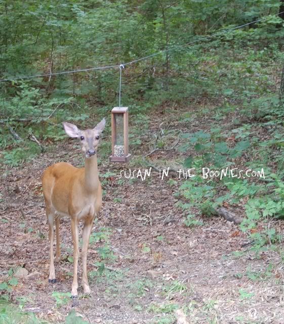 My button is Ursala, the Unconcerned, who has her mouth cram jammed full of bird seed that she was busy liberating from our bird feeder, in a very unconcerned fashion, not 6 feet away from my back door, as I snapped her picture. Isn’t she precious? You can also call her Jane Doe, if you like, since she’s in the wildlife witness protection program till hunting season is over. (Kidding: I don’t think you can hunt deer in the springtime anyway.)