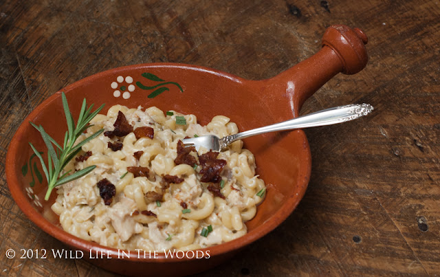 - Add goat cheese to the pot. Toss the pasta to combine it with the sauce, and bring it just back to the simmer. Adjust seasoning to taste. Sprinkle each dish with the "chicken bacon" and a tiny bit of chopped fresh rosemary.