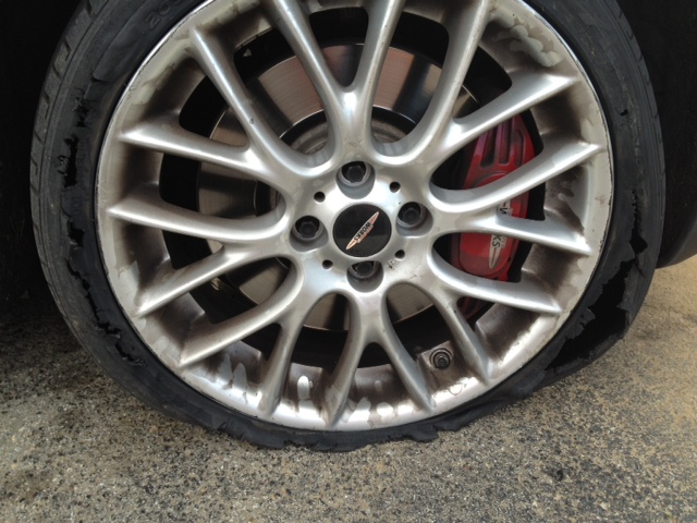 So, Kristi and I hit the road, and waved a fond farewell to Hotlanta, which appeared to be melting into a puddle in the Mini-Cooper’s rear view mirror. Dang it was hot! We drove a couple of hours, to a little town in nowhere, Georgia, that shall remain nameless. Kristi started noticing the road noise was getting louder. The Mini Cooper was equipped with tires called run-flats. I refer to Wikipedia, here, because, “Law, Miss Scawh-lett, I don’t know nuffin’ ’bout changin’ no tie-ahs”, : run-flats are designed to resist the effects of deflation when punctured, and to enable the vehicle to continue to be driven at reduced speeds and for limited distances. So we pulled off to see if perhaps any of her tires were low.