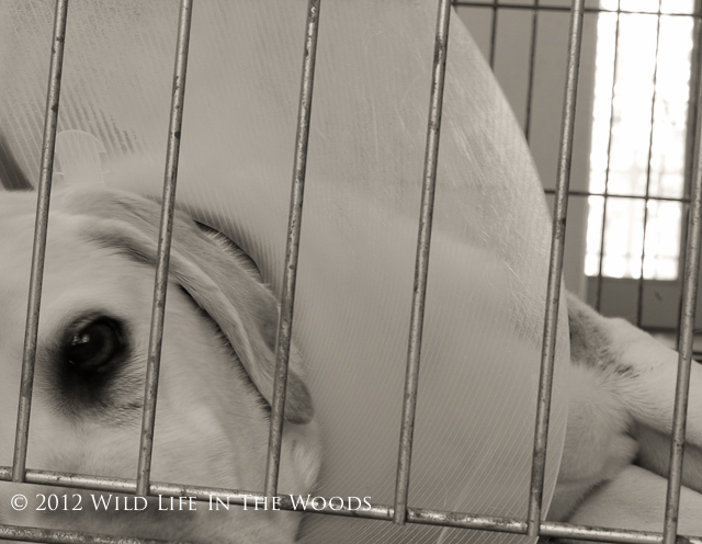 | Deacon D., wearing the Cone of Shame, in Puppy Prison. Not quite the same thing. |