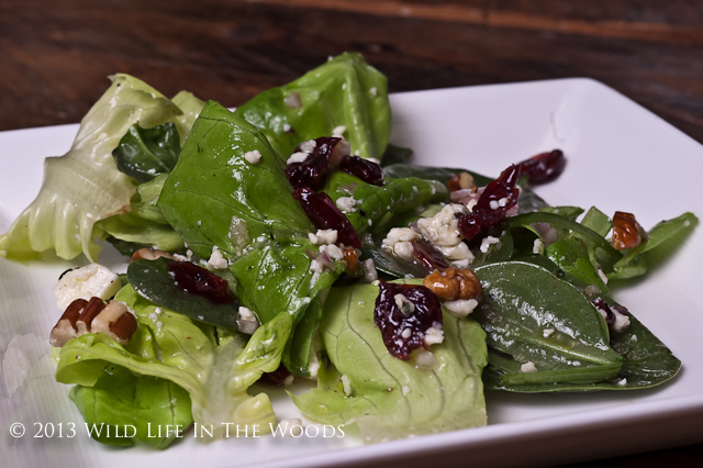 I think it’s the balance of flavors and the variety of textures that makes it so good. Creaminess, tanginess and saltiness come from the blue cheese. You get crunchiness from the pecans and the crisp salad greens. There’s a touch of spicy heat to the pepper and the shallot in the dressing. There’s acidity in the vinaigrette, as well as a touch of sweetness form the maple syrup in it. And the craisins are sweet and tart and just a bit chewy, all at the same time.